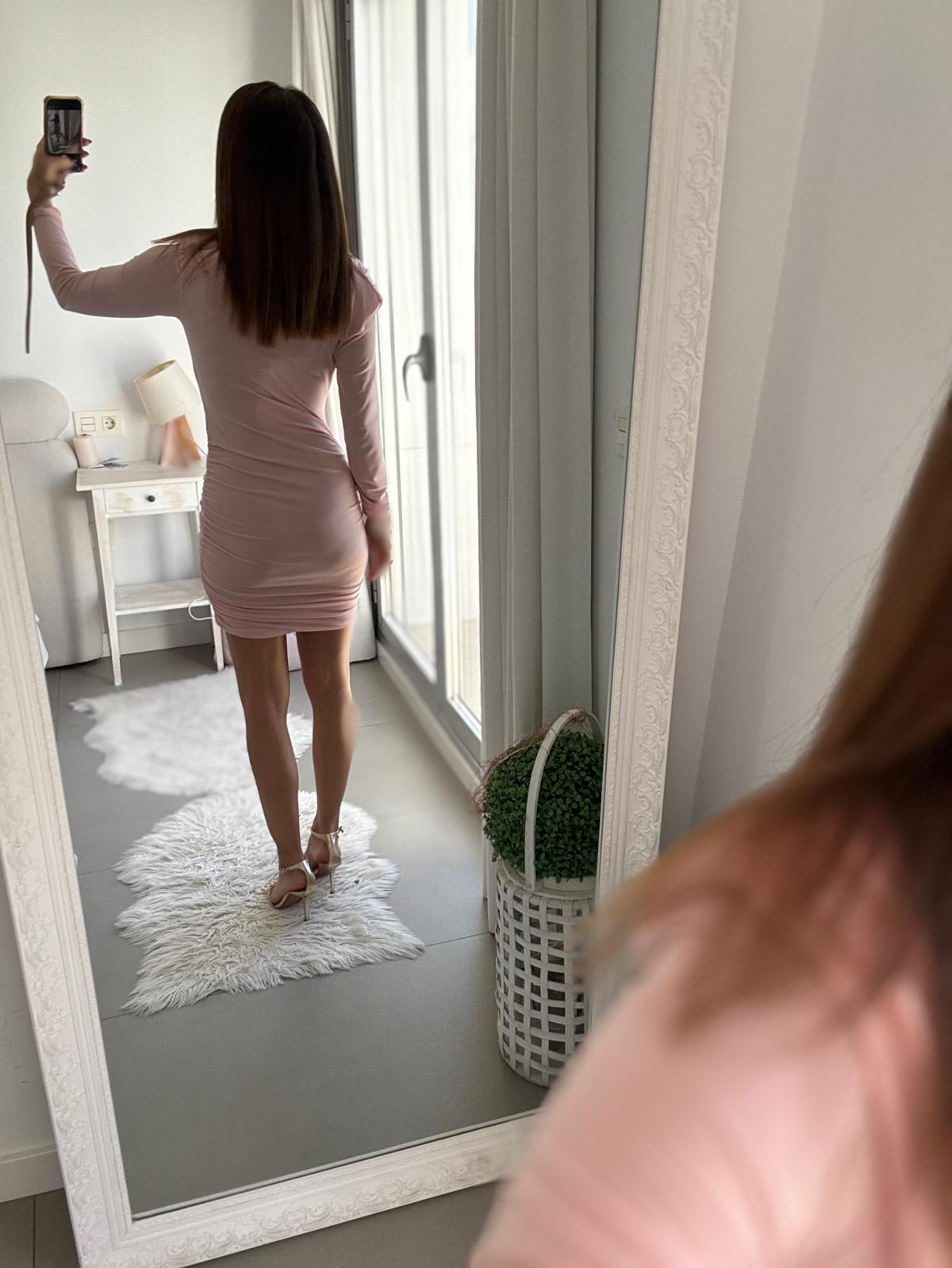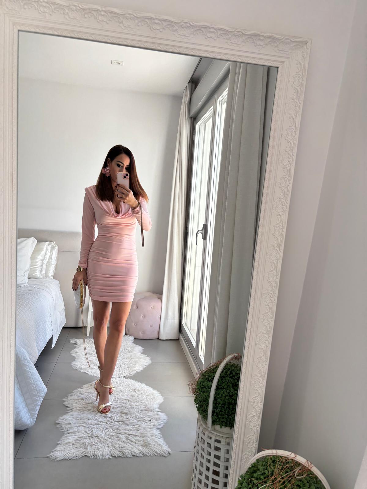 Vestido corto de manga larga y escote profundo.